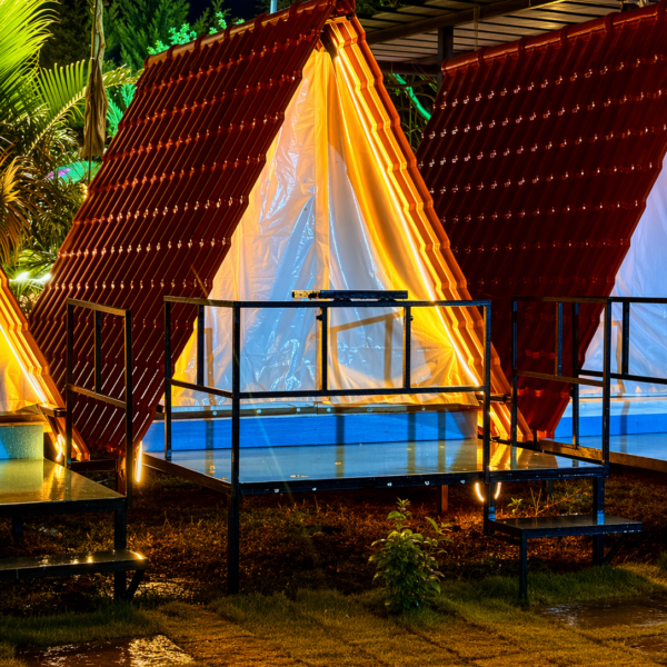 Experience a unique and stylish stay with our White Triangle Cottages at Pawna Adventure, designed for those who love modern aesthetics blended with nature. These A-frame cottages offer a cozy yet premium stay with beautiful lake surroundings, making them perfect for couples, friends, and weekend getaways. With comfortable bedding, well-maintained interiors, and a peaceful ambiance, guests can relax while enjoying scenic views of Pawna Lake. The stay also includes delicious meals, bonfire nights, music, and fun activities, creating a perfect balance of comfort and outdoor adventure. It’s an ideal choice for those looking for a memorable and Instagram-worthy lakeside experience.